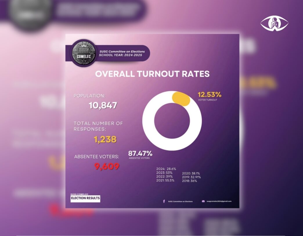 Last May 2025, the SUSG COMELEC logged a 12.53-percent turnout after only a total of 1,238 out of 10,847 students participated in the online voting,
